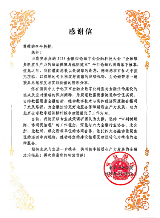 近期,北京金融法院向数经院发来感谢信,信中对数经院二级教授、常务副院长李平参加2025金融街论坛年会金融科技大会“金融服务新质生产力的法治保障与规则建立”平行论坛,并作题为“关于北京市金融业数字化转型对金融法治建设的挑战及应对策略”的报告表示感谢。